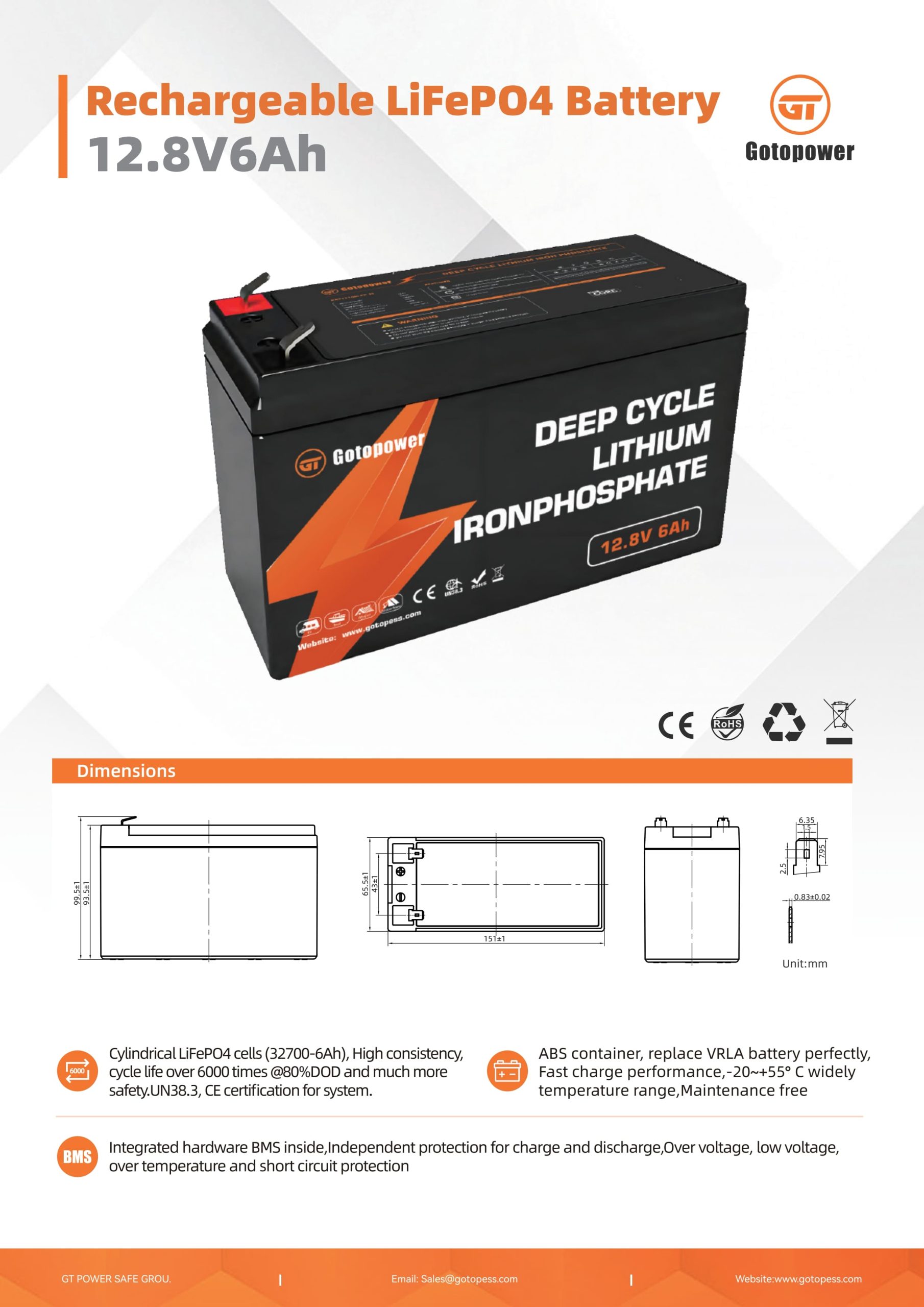 • Contenedor de ABS, sustituye perfectamente a la batería VRLA,Rendimiento de carga rápida,-20~+55° C amplio rango de temperatura,Sin mantenimiento