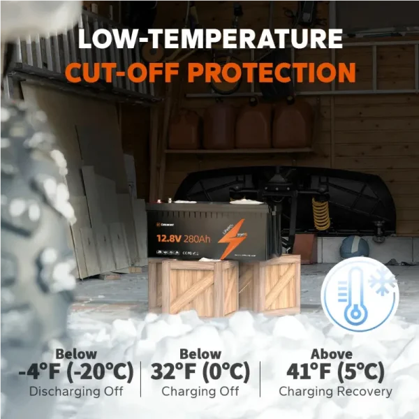 - Low-temp cut-off protection, 32℉ charging off, -4℉ discharging off, and 41℉ charging resume.
