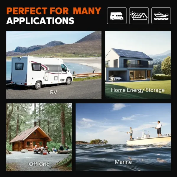 - 4 Charging ways – LiFePO4 charger/solar panel/generator/alternator.