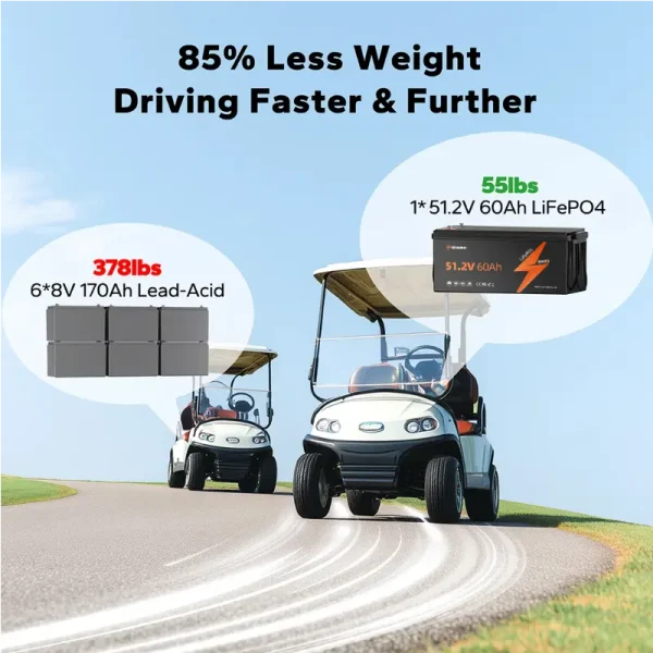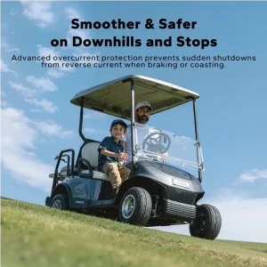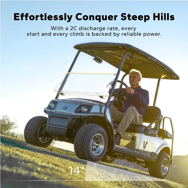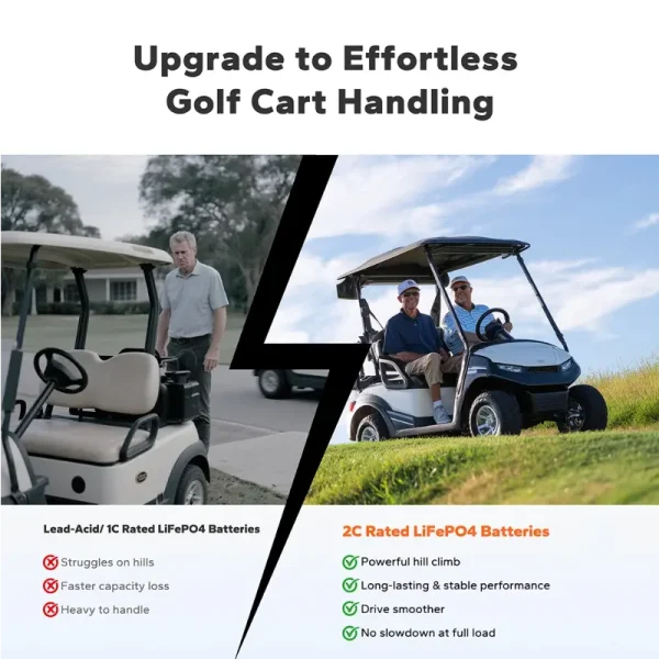 - 2C Continuous Discharging: delivers 120A continuous current and 350A (1s) peak discharge current to withstand larger surges and empower carts through any slope.