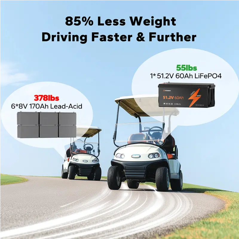 - 3072Wh of Energy: Powers your golf cart for approximately 23-28 miles, with a low energy consumption of 71.68Wh/km.