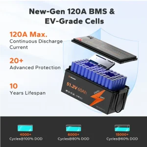 - Top Quality Cells: Utilizes top EV grade LiFePO4 cells for superior stress resistance and heat dissipation, ensuring 10+ years lifespan and 4000+ cycles at 100% DOD.